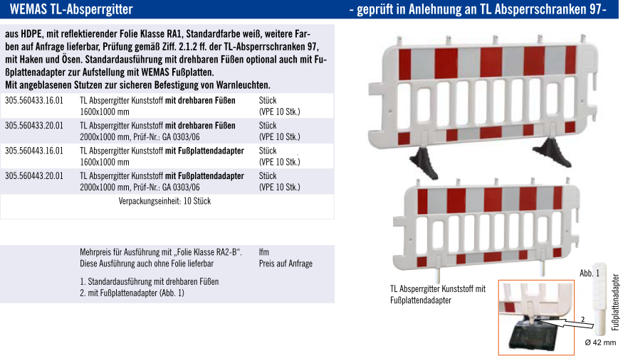 aus HDPE, mit reflektierender Folie Klasse RA1, Standardfarbe weiß, weitere Farben auf Anfrage lieferbar, Prüfung gemäß Ziff. 2.1.2 ff. der TL-Absperrschranken 97, mit Haken und Ösen. Standardausführung mit drehbaren Füßen optional auch mit Fußplattenadapter zur Aufstellung mit WEMAS Fußplatten. Mit angeblasenen Stutzen zur sicheren Befestigung von Warnleuchten.