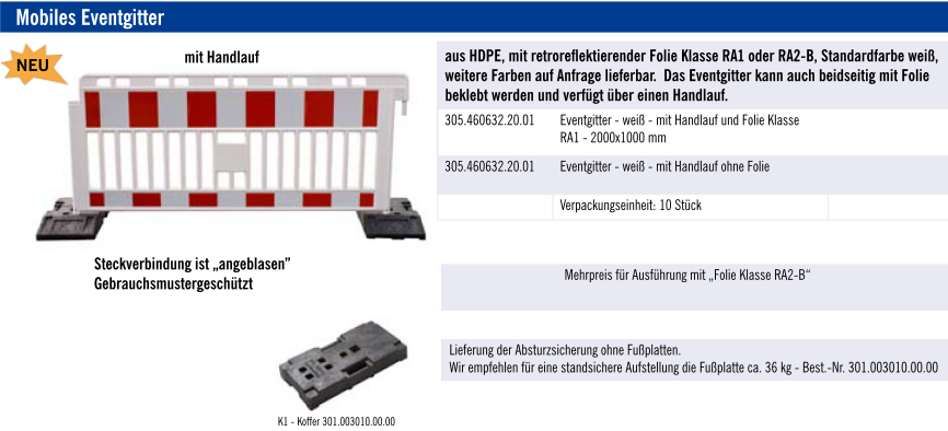 aus HDPE, mit retroreflektierender Folie Klasse RA1 oder RA2-B, Standardfarbe weiß, weitere Farben auf Anfrage lieferbar. Das Eventgitter kann auch beidseitig mit Folie beklebt werden und verfügt über einen Handlauf.