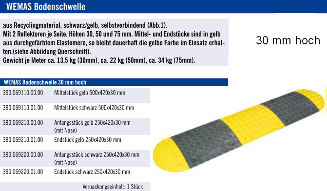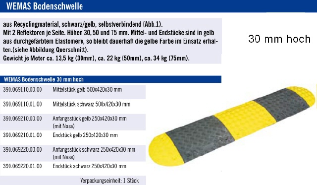 Mit 2 Reflektoren je Seite. Höhen 30, 50 und 75 mm. Mittel- und Endstücke sind in gelb aus durchgefärbtem Elastomere, so bleibt dauerhaft die gelbe Farbe im Einsatz erhalten.(siehe oben Abbildung Querschnitt).