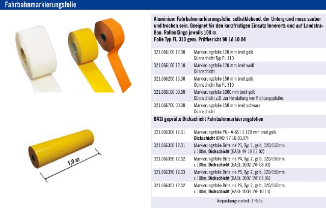 Aluminium Fahrbahnmarkierungsfolie, selbstklebend, der Untergrund muss sauber und trocken sein. Geeignet für den kurzfristigen Einsatz Innerorts und auf Landstraßen. Rollenlänge jeweils 100 m. Folie Typ FL 310 gem. Prüfbericht 98 1A 10.04