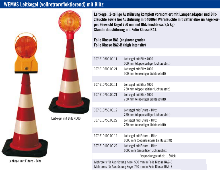 Leitkegel, 2-teilige Ausführung komplett vormontiert mit Lampenadapter und Blitzleuchte sowie bei Ausführung mit 4000er Warnleuchte mit Batteriebox im Kegelkörper. (Gewicht Kegel 750 mm mit Blitzleuchte ca. 9,5 kg). Standardausführung mit Folie Klasse RA1. Folie Klasse RA1 (engineer grade) Folie Klasse RA2-B (high intensity)