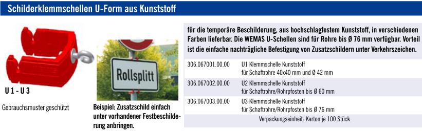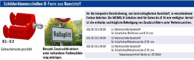 Die WEMAS U-Schellen sind für Rohre bis Ø 76 mm verfügbar. Vorteil ist die einfache nachträgliche Befestigung von Zusatzschildern unter Verkehrszeichen.