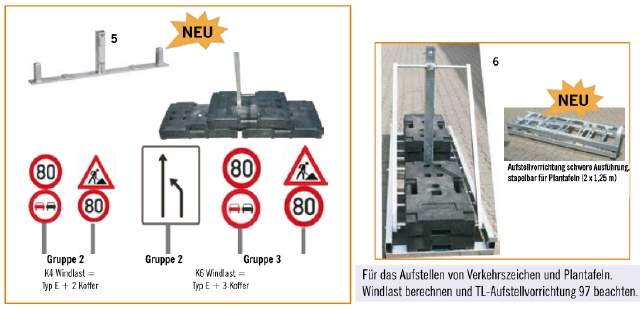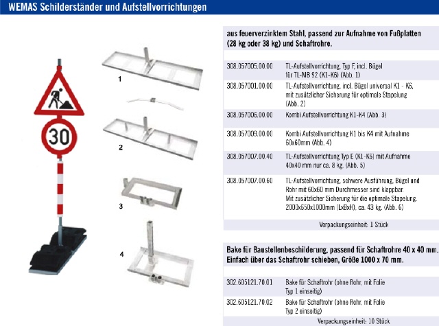Für das Aufstellen von Verkehrszeichen und Plantafeln. Windlast berechnen und TL-Aufstellvorrichtung 97 beachten. Aufstellvorrichtung schwere Ausführung, stapelbar für Plantafeln (2 x 1,25 m) NEU 6 Bake für Baustellenbeschilderung, passend für Schaftrohre 40 x 40 mm. Einfach über das Schaftrohr schieben, Größe 1000 x 70 mm.