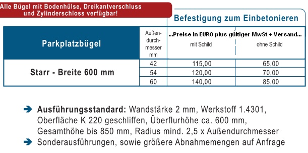 In oben aufgeführter Tabelle können Sie nach gewünschtem Außendurchmesser auswählen und erhalten so den Preis (ohne MwSt). Die Versandkosten müssen individuell ermittelt werden. Bitte schicken Sie Ihre Angebots-Anfrage mit Angabe von • Außendurchmesser • Angabe: mit / ohne Schild • gewünschte Menge • Versandort an: mailto:info@kramer-und-partner.de |
