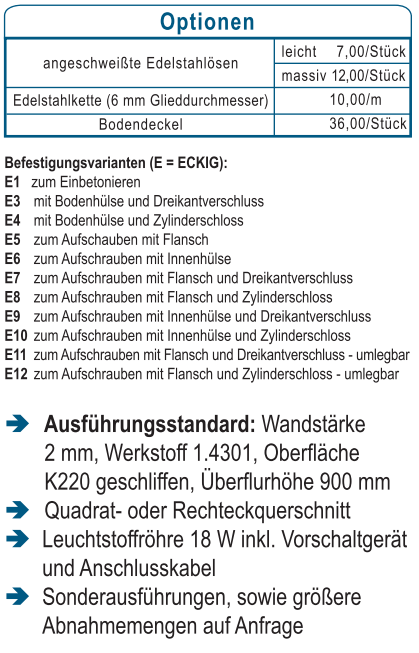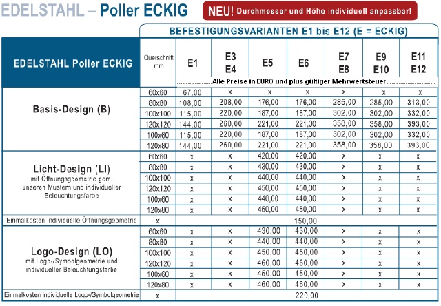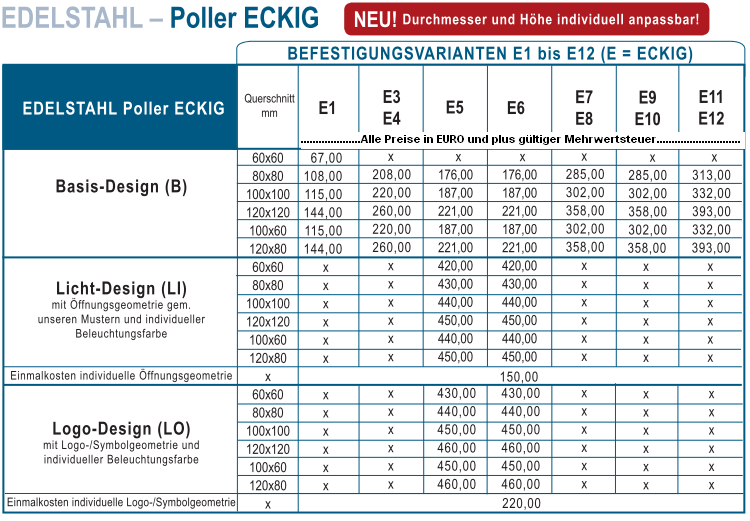 In nachstehend aufgeführter Tabelle können Sie nach gewünschtem Querschnitt die erforderliche Befestigungsvariante E1 - E12 auswählen und erhalten so den Preis (ohne MwSt). Die Versandkosten müssen individuell ermittelt werden. Bitte schicken Sie Ihre Angebots-Anfrage mit Angabe von • Querschnitt • Befestigungsvariante (E1 - E12) • gewünschte Menge • Versandort an: mailto:info@kramer-und-partner.de |