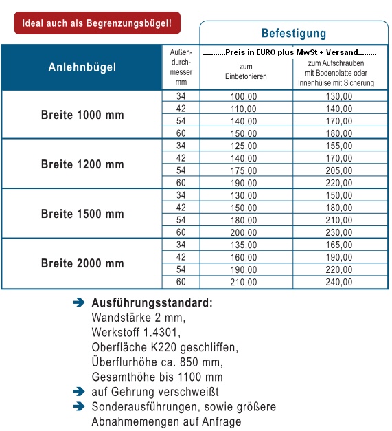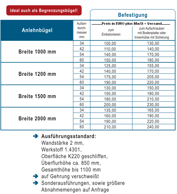 In oben aufgeführter Tabelle können Sie nach gewünschter Breite und Außendurchmesser auswählen und erhalten so den Preis (ohne MwSt). Die Versandkosten müssen individuell ermittelt werden. Bitte schicken Sie Ihre Angebots-Anfrage mit Angabe von • Breite und Außendurchmesser • Angabe: zum Einbetonieren oder mit Bodenplatte • gewünschte Menge • Versandort an: mailto:info@kramer-und-partner.de |
