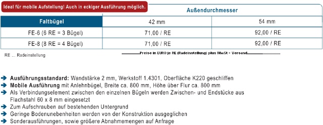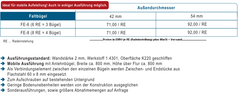 Die Versandkosten müssen individuell ermittelt werden. Bitte schicken Sie Ihre Angebots-Anfrage mit Angabe von • Angabe der Variante FE-6 oder FE-8 • gewünschter Menge der RE (Radeinstellung) • Versandort an: mailto:info@kramer-und-partner.de |
