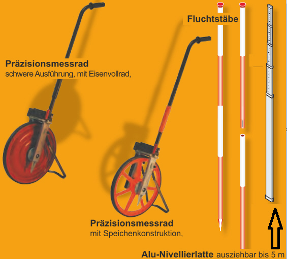 Sie sind hier: Startseite » • Hersteller » Mockenhaupt - Verkehrstechnik Vermessungsgeräte Bei nachfolgendem DOWNLOAD werden Preise angezeigt Vermessungsgeräte Präzisionsmessradschwere Ausführung, mit Eisenvollrad, Präzisionsmessrad mit Speichenkonstruktion, Koffer für Präzisionsmeßrad Fluchtstäbe Alu-Nivellierlatte [906 KB] Handlampen Streuwagen 15 l grün