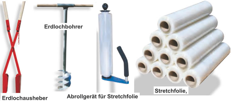 Werkzeuge: Erdlochausheber, Erdlochbohrer [894 KB] Abrollgerät für Stretchfolie, Stretchfolie, |