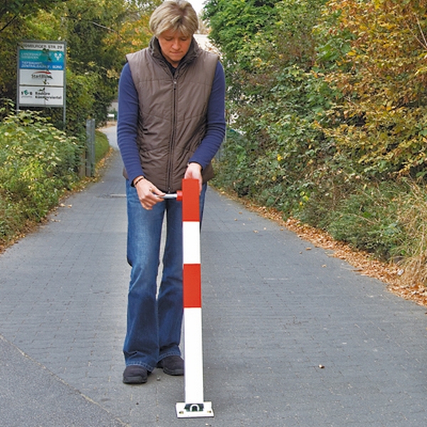 Nach Entsperrung am Dreikantverschluss (Modell SESAM B) kann der Kipp-Pfosten flach auf den Boden umgelegt werden.