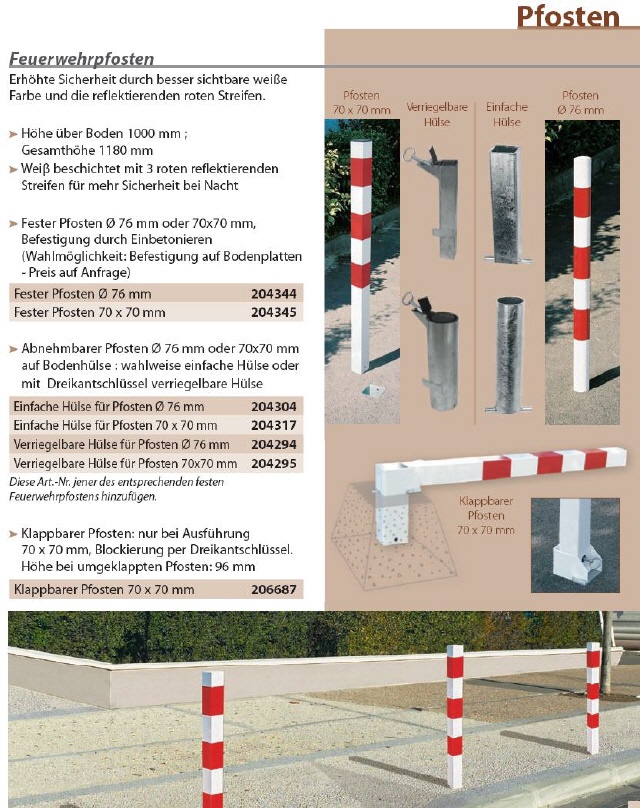 Achtung! Die Artikelnummern aus dem großen PROCITY-Katalog sind nicht mehr gültig. Im Katalog PROCITY-kompakt stimmen die Artikelnumern. Sie sind oben aufgeführt. Die Preise werden automatisch angezeigt, wenn Sie die gewünschte Artikelnummer auswählen! Zu den Feuerwehrpfosten gehört jeweils eine Hülse. Diese muß zusätzlich ausgewählt werden. Der Gesamtpreis = Feuerwehrpfosten + Hülse! Der klappbare Pfosten 206687 braucht keine zusätzliche Hülse! |