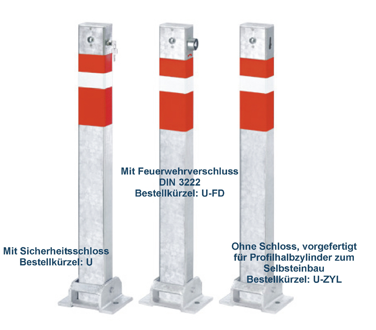 Bodenplatte aus Profilstahl. Die Befestigung erfolgt mit M 16 Steinschrauben (im Preis inbegriffen). Das oben angebrachte Schloss wird nur zum Umlegen des Pfostens benötigt. Trotz größter Stabilität extrem geringe Bauhöhe (H= 80 mm) im umgelegten Zustand. Pfosten werden einbaufertig mit Schlüssel, Befestigung und Montageanleitung geliefert. Befestigung auch mit Bodenanker möglich.