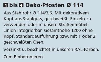 Aus Stahlrohr Ø 114/3,6. Mit dekorativem Kopf aus Stahlguss, geschweißt. Einzeln zu verwenden oder in unsere Straßenmöbel-Linien integrierbar. Gesamthöhe 1200 ohne Kopf. Standardausführung bzw. mit 1 oder 2 geschweißten Ösen.