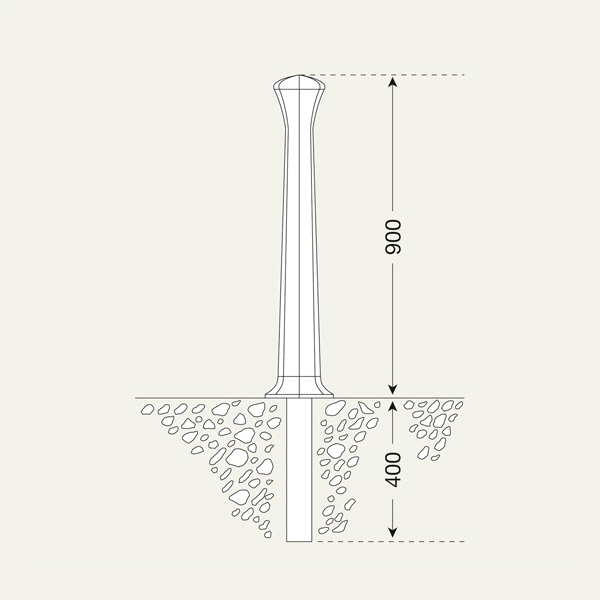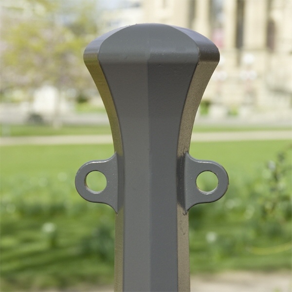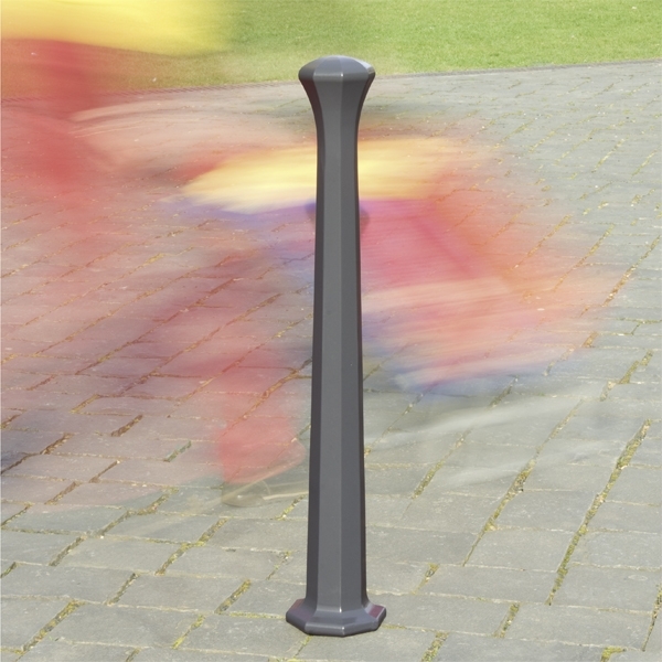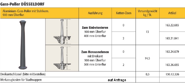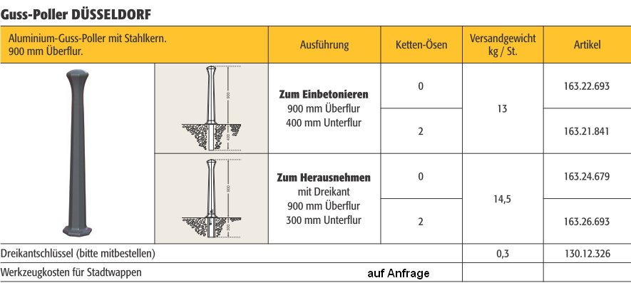 Aluminium-Guss-Poller mit Stahlkern, 900 mm Überflur, in RAL 7016 lackiert. Zum Einbetonieren oder zum Herausnehmen mittels Dreikantschlüssel (DIN 3223). Standard-Ausführung ohne Kettenösen. Zur Anbringung von Ketten ist eine Variante mit zwei eingegossenen Kettenaufnahmen verfügbar.