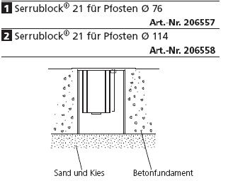 Neu: Die Hülsen“ Serrublock® 21“ für Pfosten sind für die Standard- Pfosten (Feste Pfosten Ø76, Ø114) geeignet.