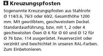 Standardausführung, bzw. mit 1, 2 oder 4 geschweissten Ösen Ø 6 für Ø 60 und Ø 12 für Ø 76 bzw. 114 ausgerüstet. Feuerverzint oder verzinkt und beschichtet in unseren RAL-Farben. Zum Einbetonieren.