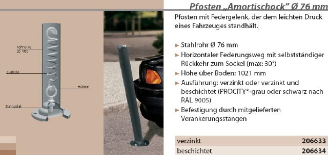 Sie sind hier: Startseite » • Strassenausstattung » • Pfosten & Poller » Pfosten/Poller/Bodenhülsen Pfosten "Amortischock" Ø 76 mm Pfosten mit Federgelenk, der dem leichten Druck eines Fahrzeuges standhält. Aktion war erfolgreich Das hat leider nicht geklappt. Warenkorb anzeigen <<< --- Zur Kasse gehen ------- Weiter einkaufen Welche Artikelnummer?: ??? 206633 verzinkt 206634 beschichtet Anzahl: St In den Warenkorb Auf den Merkzettel 206633 206634