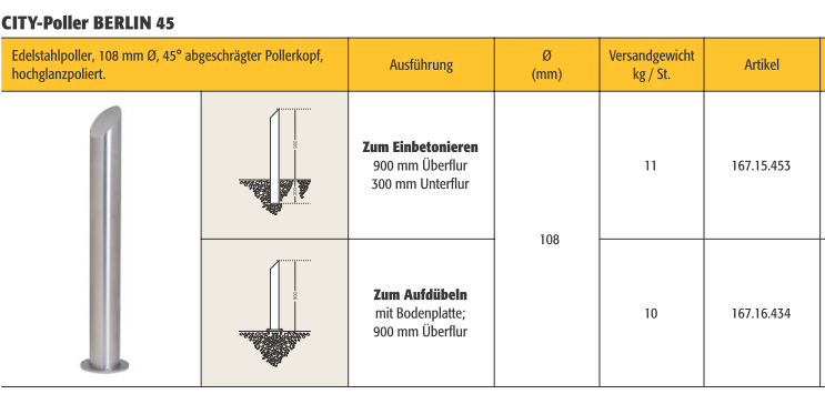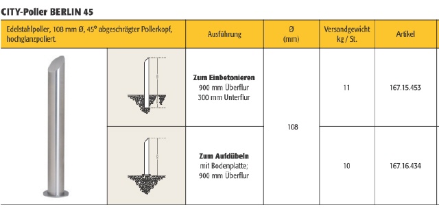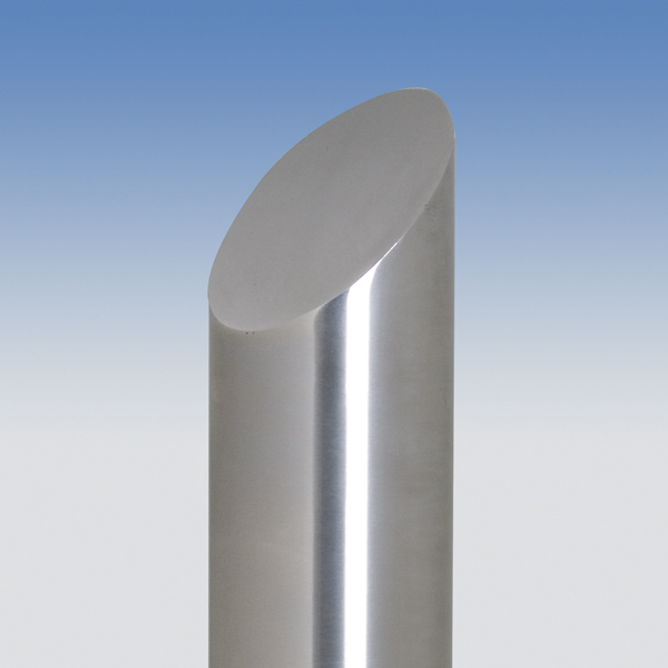 Der CITY-Poller BERLIN 45 basiert auf dem CITY-Poller BERLIN, 108 mm, jedoch mit einem um 45° abgeschrägten Pollerkopf - ebenfalls hochglanzpoliert.