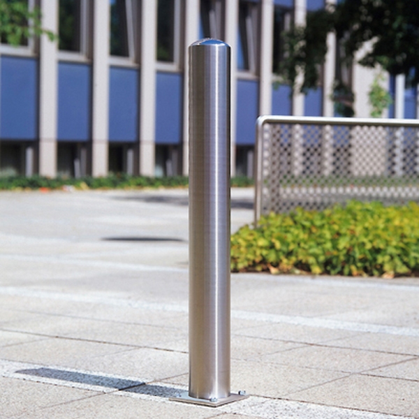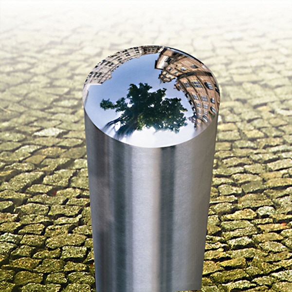 Der nahtlose Übergang der dreifach gebürsteten Edelstahl-Oberfläche zur hochglanzpolierten Kappe verleiht dem Poller einen noblen Charakter.