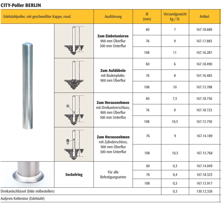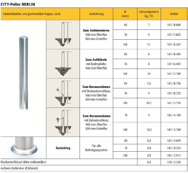 • Drei Querschnitte: Ein kraftvoller Poller mit 108 mm Ø, sowie schlankere Varianten mit 60 oder 76 mm Ø