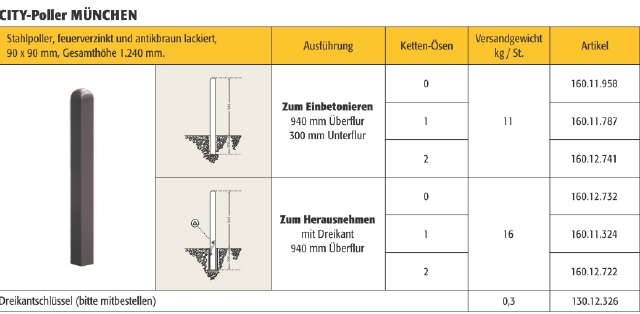 90 x 90 / 1.240 / 3 mm; davon 940 mm Überflur. Feuerverzinkt; zusätzlich antikbraun lackiert (RAL 8019). Den CITY-Poller München gibt es zum festen Einbau mit Erdanker und herausnehmbar mit Feuerwehr-Dreikant nach DIN 3223.