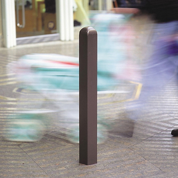 Ein kräftiger Quadratpoller. Das Vierkantprofil geht durch die angeformte Kappe in eine harmonisch proportionierte Rundung über.