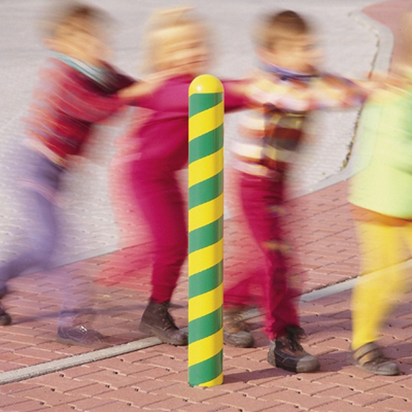 Dieser attraktive Stahlpoller mit geformter Aluminiumkappe wirkt durch seinen leichten, unbeschwerten Charakter auf seine Umgebung. Vielfältige Farbspiele geben dem Stadtplaner zusätzliche Optionen. 108 Ø / 1.250 / 2,9 mm davon 950 mm Überflur. Feuerverzinkt. Zusätzlich mit schmalen gelb-grünen Diagonalstreifen lackiert. Andere RAL-Farbtöne auf Anfrage.