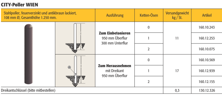 Den CITY-Poller WIEN gibt es zum festen Einbau mit Erdanker und herausnehmbar mit Feuerwehr-Dreikant nach DIN 3223.