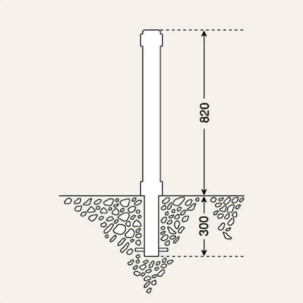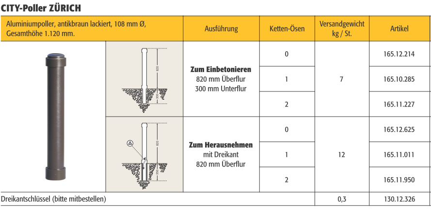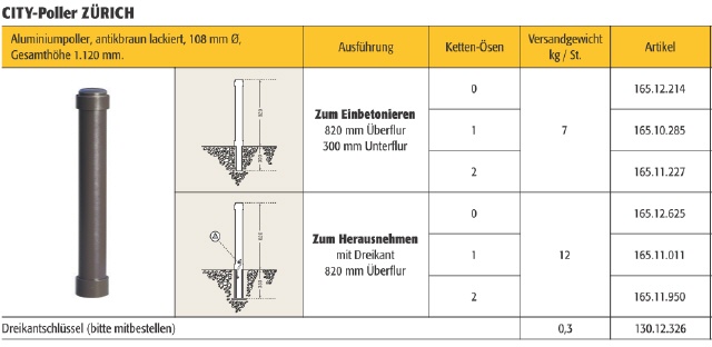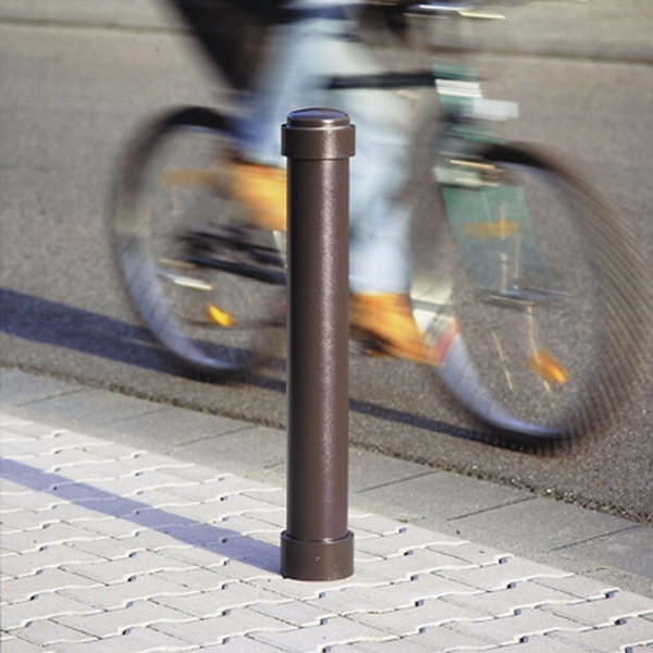 Ein leichter Aluminium-CITY-Poller, der durch sein geschmackvolles Design leichter und eleganter als ein normaler Rundpfosten wirkt. Aluminium 108 Ø / 1.120 / 4 mm, davon 820 mm Überflur. Zum festen Einbau mit Erd anker. Oder herausnehmbar mit seitlichem Feuerwehr-Dreikant nach DIN 3223. Antikbraun lackiert (RAL 8019).