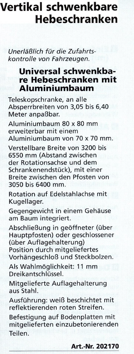 Sie sind hier: Startseite » • Strassenausstattung » • Straßenausstattung » Schranken Universal-Hebeschranke Universal schwenkbare Hebeschranke mit Aluminiumbaum Aktion war erfolgreich Das hat leider nicht geklappt. Warenkorb anzeigen <<< --- Zur Kasse gehen ------- Weiter einkaufen Artikel-Nr.: pro-202170 Lieferbar in 1-3 Wochen... genaue Angabe bei Angebotsanforderung! 1.691,00 EUR Preis enthält 19% USt. - plus ggf. Versandkosten siehe Versand / Widerrufsrecht...Fragen zum Produkt?...Tel. 05671 2549 Versand-Gewichtsklasse: 105.8 kg Anzahl: St In den Warenkorb Auf den Merkzettel