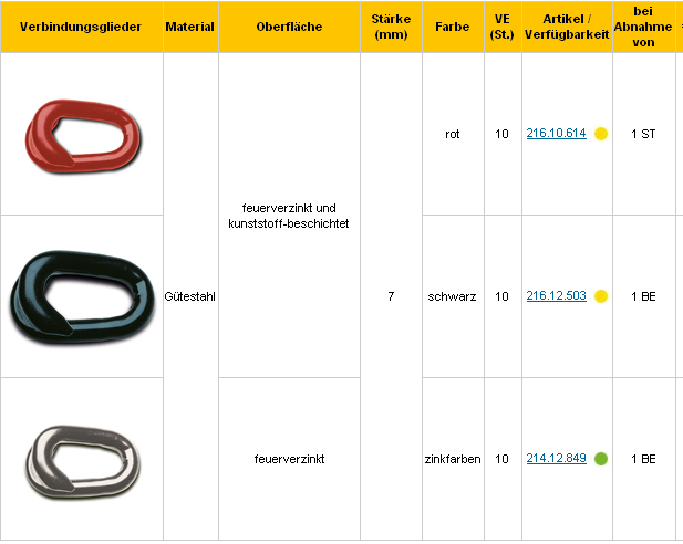 Sie sind hier: Startseite » • Strassenausstattung » • Straßenausstattung » Ketten Verbindungsglieder 216.10.614 216.12.503 214.12.849 Zum Vergrößern auf die Grafik klicken Aktion war erfolgreich Das hat leider nicht geklappt. Warenkorb anzeigen <<< --- Zur Kasse gehen ------- Weiter einkaufen Welche Artikelnummer?: Bitte wählen Sie aus! 216.10.614 = rot, 7mm,, VE 10 Stück 216.12.503 = 7 mm, schwarz, VE 10 Stück 214.12.849 = zinkfarber, 7 mm, VE 10 Stück Anzahl: St In den Warenkorb Auf den Merkzettel