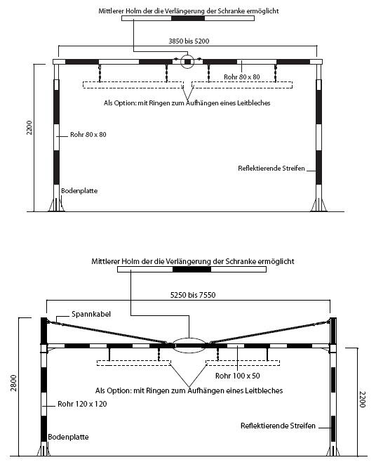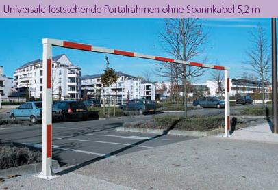 Ein mittlerer Querholm wird zwischen zwei waagerechten Stangen verschoben, um den Portalrahmen zentimetergenau an den Montageort anzupassen. Der Portalrahmen ist für alle Absperrbreiten geeignet.