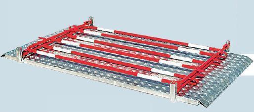 Rutschfeste Übergangszone aus Aluminium. Die Geländer bestehen aus faltbar gegliederten Schranken, um den Transport zu vereinfachen.