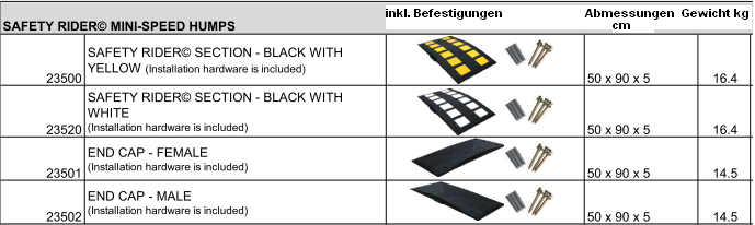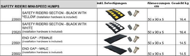 Safety Rider ® Temposchwellen werden an die Straßenbreite angepaßt. Die Standardabmessung jedes Elements ist 90 x 50 cm. Die Endkappen haben dasselbe Profil wie die Mittelteile. Das Gewicht der Mittelteile beträgt 16,4 kg pro Stück, während die Endkappen 14,5 kg pro Stück wiegen. Jedes Teil wird auf eine befestigte Fläche mit sechs Schrauben und Plastikdübeln installiert.