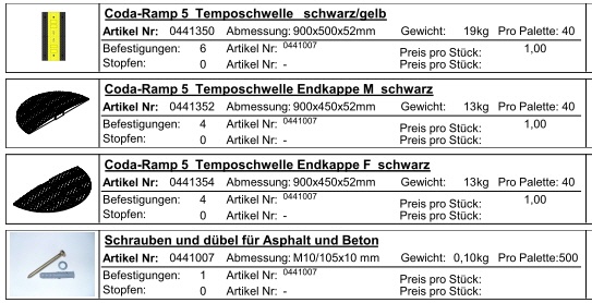 Die Temposchwelle Coda-Ramp 5 ist ein neues Produkt. (Wir haben deshalb noch keine Beschreibung in Deutsch.) Sie zeichnen sich dadurch aus, dass die gelben Markierungen nicht mehr aufgebrachte farbige Reflexstreifen sind. Die gelben Teile sind jetzt Bestandteil des Grundmaterials und können sich nicht mehr ablösen. Zusätzlich sind runde Reflektoren eingearbeitet.