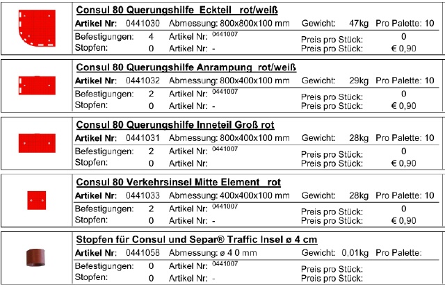 Consul 80 Querungshilfe, verschiedene Elemente, die zu einer Verkehrsinsel zusammengestellt werden können.