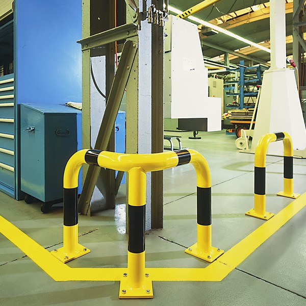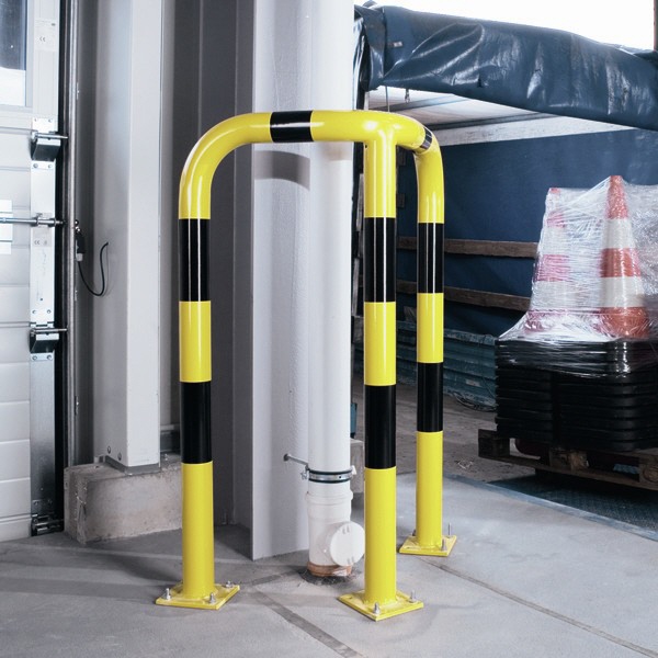 Die Schutzbügel trennen verschiedene Verkehrswege (z.B. Stapler- und Personenverkehr), schützen Maschinen, Pfeiler, Stützen, Säulen, Regale, (Roll-)Tore, Laderampen etc.