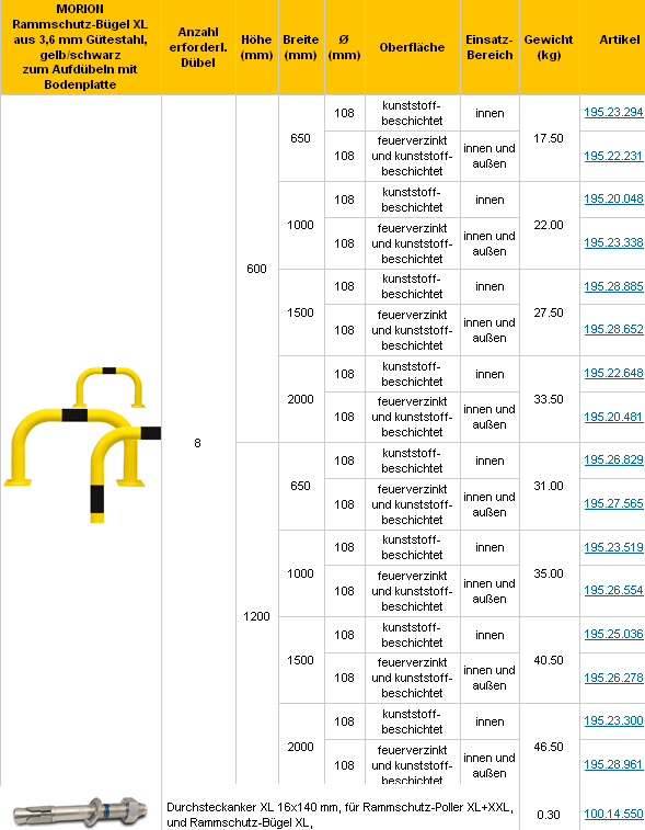 • Oberflächenbehandlung: gelb kunststoffbeschichtet , mit schwarzen Signalstreifen (Inneneinsatz) oder feuerverzinkt und gelb kunststoffbeschichtet, mit schwarzen Signalstreifen (Außeneinsatz)