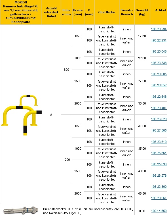 • Die Rammschutz-Bügel XL werden aufgedübelt (Bodenplatte 200 x 140 x10 mm). Auf Wunsch ist auch eine Ausführung zum Einbetonieren lieferbar (ohne Aufpreis).