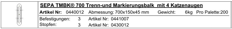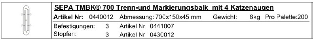 SEPA TMBK® 700 Trenn- und Markierungsbalken mit 4 Katzenaugen